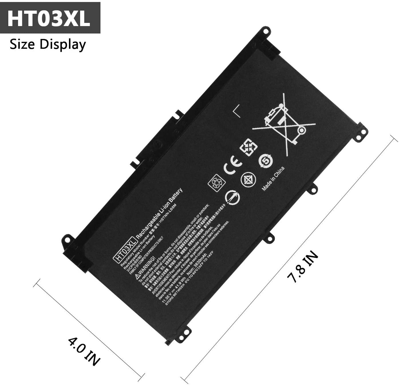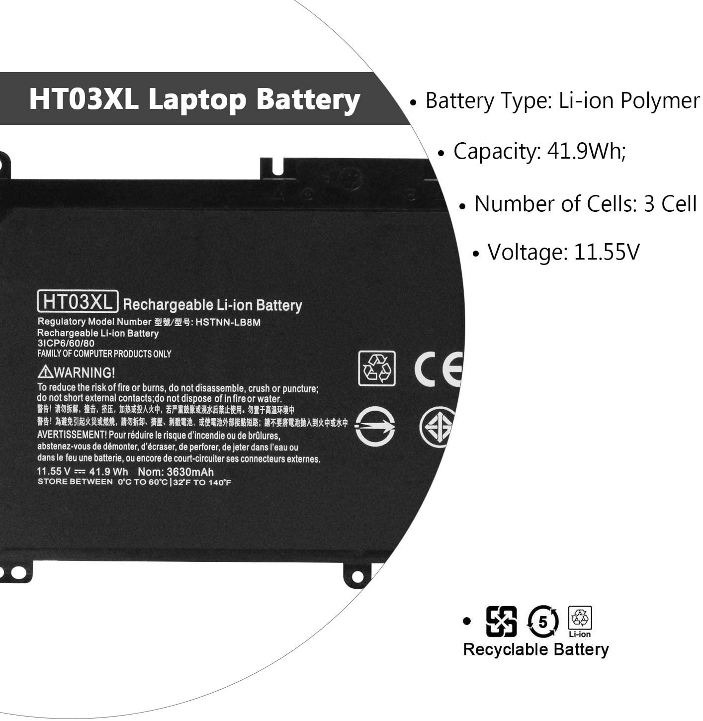 Item Model: HT03XL; Product Type: Replacement battery; Battery Type: Li-ion; Number of Cells: 3 Cell; Voltage: 11.55V; Capacity: 41.9Wh; Battery Life: Up to 500 recharge cycles over the life of the battery.